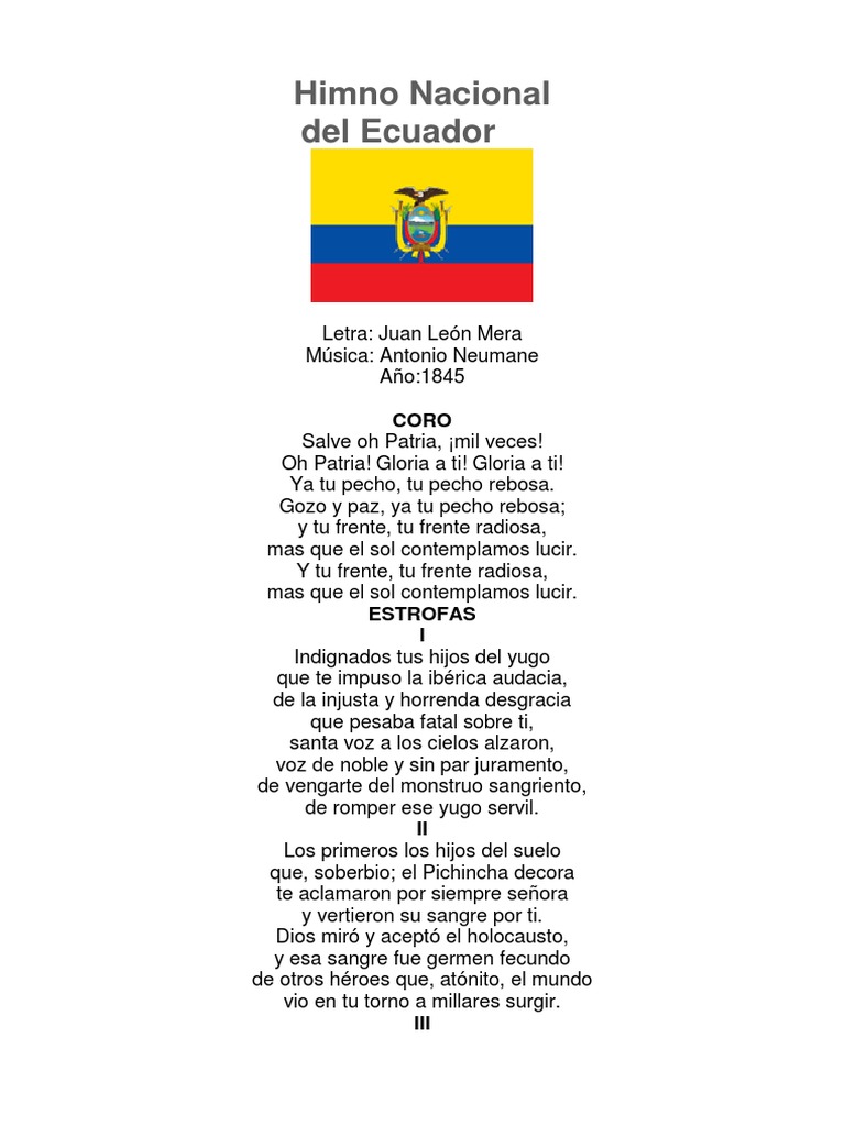 Himno de estados unidos (en español) himno de francia (en español) himno de canadá. Comenta o pregunta lo que desees sobre 'himno de ecuador' Historia del himno nacional ecuatoriano. 4.0 descargar himno en mp3. Los integrantes del coro de la escuela superior politécnica del litoral, espol, interpretan la letra de juan león mera y música de antonio neumane, como un h.